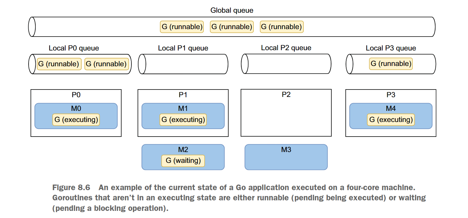 不能直接创建Thread, 但是可以创建goroutine; os线程由os调度, goroutine在os线程内由goruntime调度; GOMAXPROCS定义产生多少OS线程, 在有block时, 还会生成新的OS线程, GOMAXPROCS默认等于机器的逻辑核心数; goroutine的状态, Executing: 在OS线程上运行, Runnable: 等待进入Executing, Waitting: stopped并等待一些事情完成(system call, sync, wait mutex); 1.14之前只会在chan send/recieve, i/o, wait mutext时发生context switch, 之后的版本会将运行超过10ms的goroutine标记为preemptible, 并有机会context-switched off被其他goroutine替换